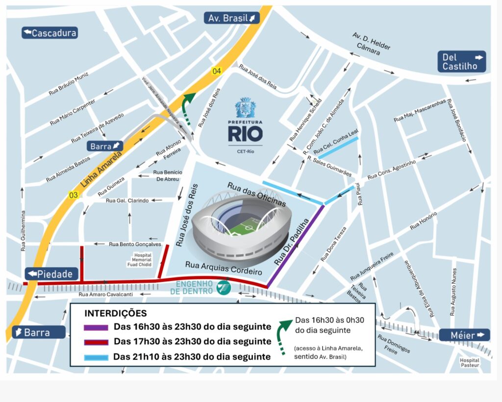 O Centro de Operações e Resiliência da Prefeitura do Rio (COR-Rio) informa que uma operação de trânsito foi montada nesta quarta-feira (15/10) para o jogo entre Botafogo e Flamengo, pelo Campeonato Brasileiro, às 19h30, no estádio Nilton Santos, no Engenho de Dentro, Zona Norte do Rio. Os bloqueios no entorno do estádio começam a partir das 16h30.