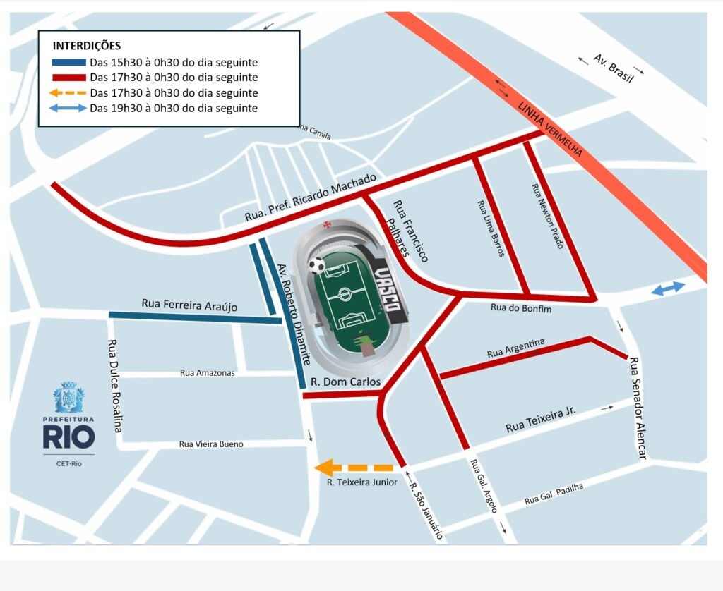 O Centro de Operações e Resiliência da Prefeitura do Rio (COR-Rio) informa que um esquema de trânsito foi elaborado pela CET-Rio para as vias no entorno do estádio de São Januário, no bairro Vasco da Gama, nesta quarta-feira (11/2), para a realização da partida Vasco x Bahia, às 21h30. As interdições começam às 15h30, com previsão de liberação à 0h30 da quinta-feira (12/2).