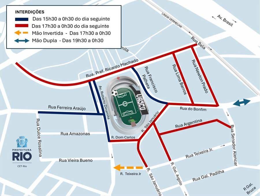 O Centro de Operações e Resiliência da Prefeitura do Rio (COR-Rio) informa que a CET-Rio montou um esquema especial de trânsito para este sábado (14/2), por conta do jogo entre Vasco e Volta Redonda, pelo Campeonato Carioca, que acontece às 21h30, no estádio São Januário, no bairro Vasco da Gama. As interdições ao trânsito de veículos iniciam às 15h30 de sábado.