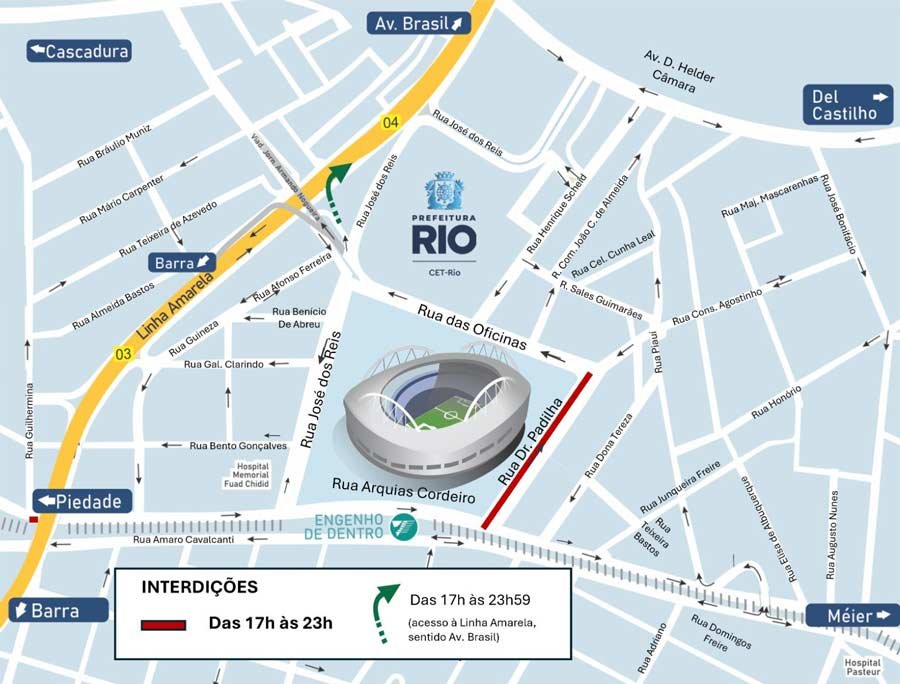 A partir das 17h, haverá interdição ao trânsito de veículos na região. A operação contará com agentes da CET-Rio, apoiadores de tráfego, veículos operacionais e motocicletas. O efetivo atuará na segurança viária, na fluidez do trânsito e na manutenção dos cruzamentos livres, bem como na orientação a pedestres, torcedores e motoristas.