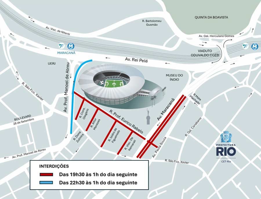 O Centro de Operações e Resiliência da Prefeitura do Rio (COR-Rio) informa que um esquema de trânsito foi elaborado pela CET-Rio para as vias no entorno do Maracanã, nesta segunda-feira (2/3), para a realização da partida Madureira x Flamengo, às 21h, pelo Campeonato Carioca. As interdições começam às 19h30, com previsão de liberação às 01h30 de terça-feira (3/2).