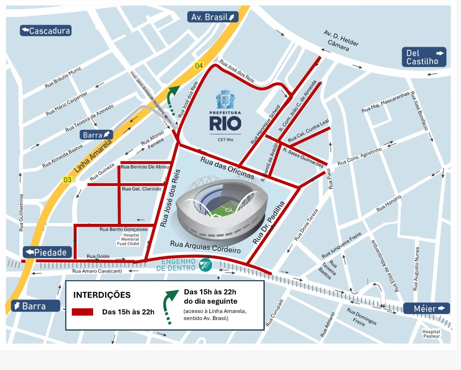 O acesso à Linha Amarela, sentido Avenida Brasil/Fundão, poderá ser realizado pela rua das Oficinas, a partir do cruzamento com a rua José dos Reis, sob o viaduto Jornalista Armando Nogueira.
