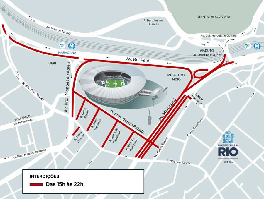 O Centro de Operações e Resiliência da Prefeitura do Rio (COR-Rio) informa que irá implantar uma operação especial de trânsito neste domingo (25/1) para o jogo entre Fluminense e Flamengo pelo Campeonato Carioca. O jogo está programado para as 18h, no estádio do Maracanã. As interdições ao trânsito de veículos na região começam às 15h e vão até as 22h.