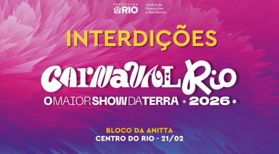 O Centro de Operações e Resiliência da Prefeitura do Rio (COR-Rio) informa que diversas vias serão interditadas para garantir a folia do Carnaval no centro da cidade, neste fim de semana (21 e 22/2), no encerramento dos megablocos do Circuito Preta Gil. O esquema de tráfego começará às 5h de sábado (21/02) para o desfile do Bloco da Anitta, e no mesmo horário no domingo (22/02), quando o Monobloco encerra o carnaval 2026 desfilando pela Avenida Presidente Antônio Carlos. Os desfiles vão acontecer das 9h às 12h, com concentração duas horas antes.