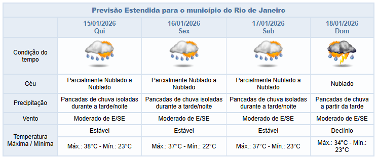 Entre a quinta-feira e o sábado (15/01 e 17/01), a atuação de áreas de instabilidade associadas ao calor influenciarão o tempo na cidade do Rio de Janeiro. Assim, a previsão é de céu parcialmente nublado a nublado com pancadas de chuva isoladas na tarde/noite de ambos os dias. Os ventos estarão predominantemente moderados.