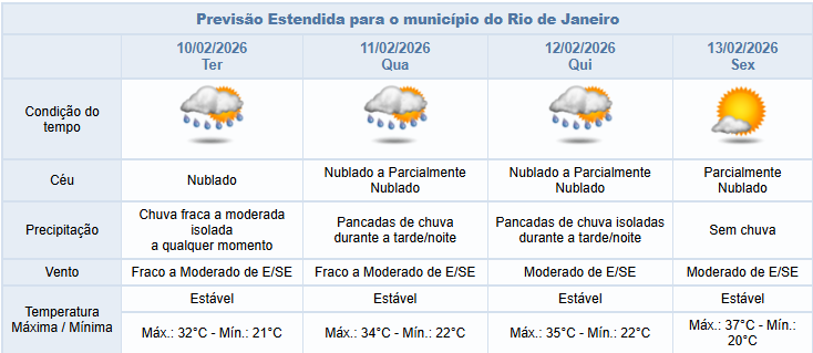 A quarta e a quinta-feira (11 e 12/02), serão ainda de tempo instável na cidade do Rio, com céu nublado e previsão de pancadas de chuva a partir da tarde. Os ventos estarão fracos a moderados.