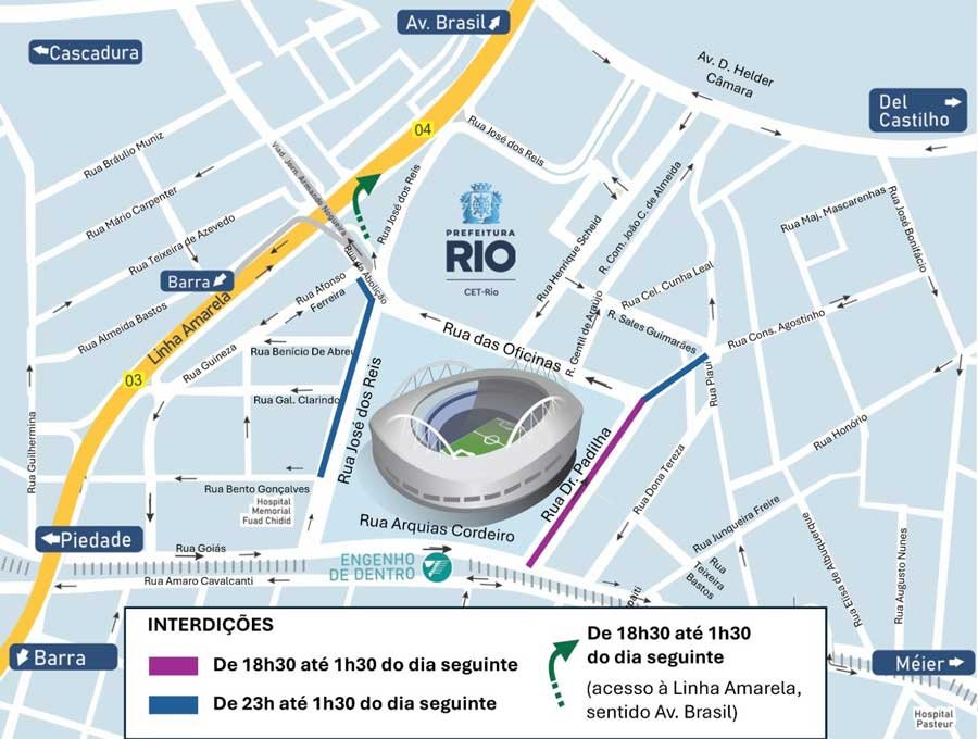 Das 18h30 à 1h30 do dia seguinte: O acesso à Linha Amarela (sentido Avenida Brasil/Fundão) poderá ser realizado pela Rua das Oficinas, a partir do cruzamento com a Rua José dos Reis, sob o Viaduto Jornalista Armando Nogueira.