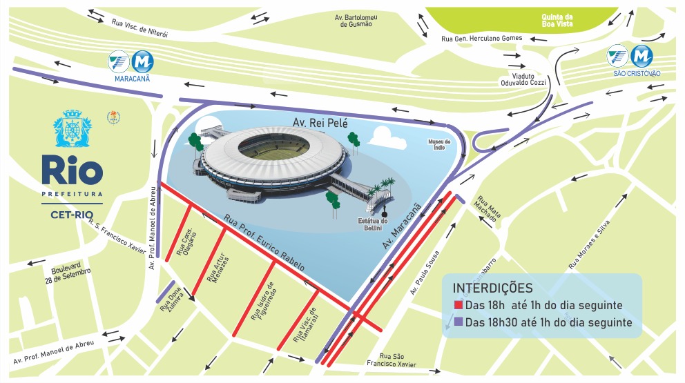A partir das 18h, haverá interdições ao trânsito de veículos na região onde acontece a partida.