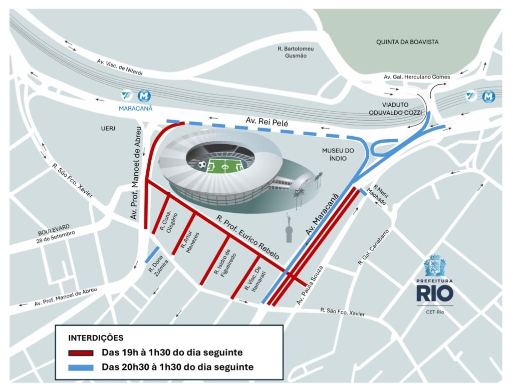 O Centro de Operações e Resiliência da Prefeitura do Rio (COR-Rio) informa que a CET-Rio realizará uma operação de trânsito na quarta-feira (22/4) para o jogo entre Flamengo e Vitória pela Copa do Brasil, que acontecerá às 21h30, no estádio do Maracanã. As interdições ao trânsito de veículos na região começam a partir das 19h e vão até 1h30 de quinta-feira (23/4). Além dos locais regulamentados com proibição de estacionamento, outras vias também estarão restritas ao estacionamento a partir das 10h.