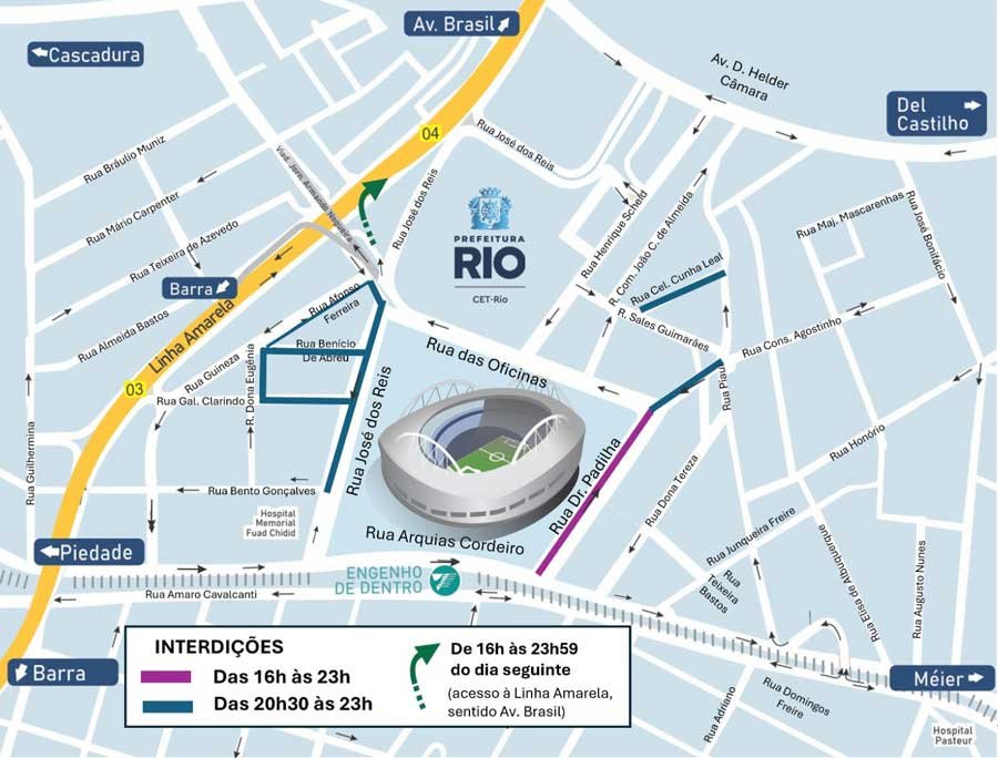 - O acesso à Linha Amarela (sentido Avenida Brasil/Fundão) poderá ser realizado pela Rua das Oficinas, a partir do cruzamento com a Rua José dos Reis, sob o viaduto Jornalista Armando Nogueira.