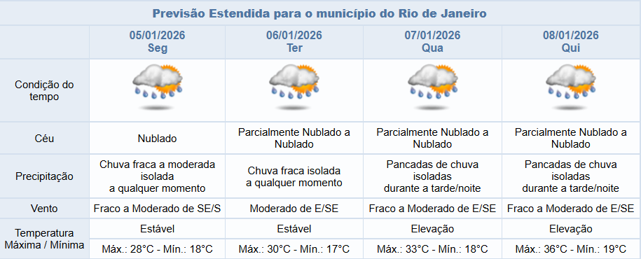 Na segunda-feira (05/01), por conta da atuação de um canal de umidade sobre a Região Sudeste, a nebulosidade estará variada com predomínio de céu nublado e a previsão é de chuva fraca a ocasionalmente moderada a qualquer momento. Os ventos estarão moderados.