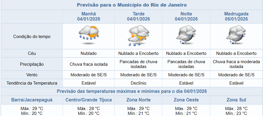 De acordo com o Sistema Alerta Rio, neste domingo (04/01), o céu estará predominantemente nublado e há previsão de chuva fraca isolada no período da manhã e pancadas de chuva nos períodos da tarde e noite. Os ventos estarão moderados e as temperaturas apresentarão declínio, com mínima prevista de 20°C e máxima prevista de 29°C.