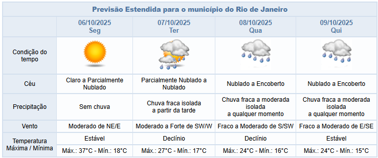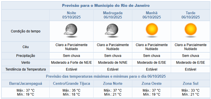 De acordo com o Alerta Rio, o final desta tarde e noite de domingo (05/10) será marcado por céu com poucas nuvens e não há previsão de chuva, e os ventos estarão moderados a ocasionamente fortes, principalmente nas regiões litorâneas, mantendo a tendência do dia. Hoje, a mínima registrada foi de 17,9°C e a máxima de 36,1°C.