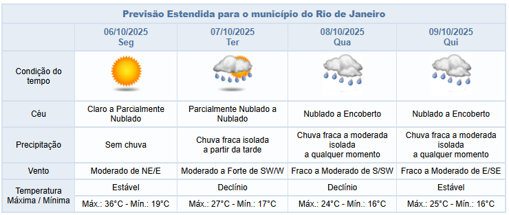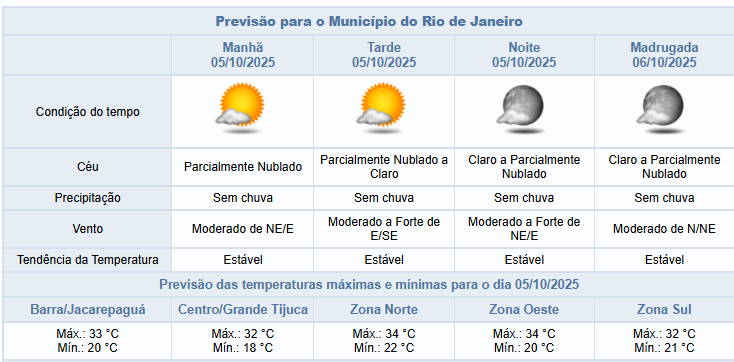 Segundo o Alerta Rio, este domingo (05/10) será de tempo estável devido a um sistema de alta pressão. Assim, a previsão é de céu com poucas nuvens e sem chuva na cidade do Rio de Janeiro. Os ventos estarão moderados a fortes, principalmente na tarde/noite nas regiões litorâneas, e as temperaturas estarão estáveis, com mínima prevista de 18°C e máxima prevista de 34°C.