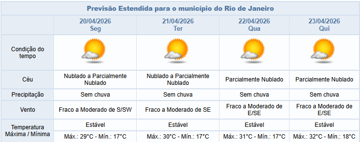Entre segunda e quinta-feira (20/04 e 23/04), a nebulosidade estará variada, com predomínio de céu parcialmente nublado e sem previsão de chuva na cidade do Rio. Os ventos estarão fracos a moderados.