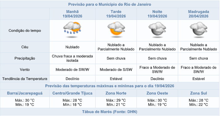 De acordo com o Sistema Alerta Rio, o tempo na capital fluminense, neste domingo (19/04), será influenciado pelo transporte de umidade do oceano em direção ao continente. O céu estará nublado a parcialmente nublado e há previsão de chuva fraca a moderada isolada no período da manhã. Os ventos estarão fracos a moderados, sendo mais intensos no período da tarde. As temperaturas apresentarão declínio, com mínima prevista de 18°C e máxima prevista de 30°C.