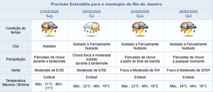 Já na quarta e quinta-feira (25/02 e 26/02), em função da formação e posterior atuação de um sistema de baixa pressão no litoral do Rio, a previsão para a capital fluminense é de nebulosidade variada e chuva fraca a moderada ao longo do dia, sendo em caráter de pancada e acompanhada de raios a partir da tarde de quarta-feira. Os ventos estarão entre fracos e moderados.