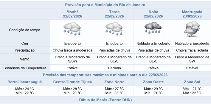De acordo com o Sistema Alerta Rio, o tempo na capital fluminense, neste domingo (22/02), será influenciado pela entrada de umidade do oceano em direção ao continente, em conjunto com áreas de instabilidade. O céu estará nublado a encoberto e há previsão de chuva fraca a moderada a qualquer momento, sendo em caráter de pancada a partir da tarde. Os ventos estarão entre fracos a moderados e as temperaturas apresentarão ligeiro declínio, com máxima prevista de 29°C.