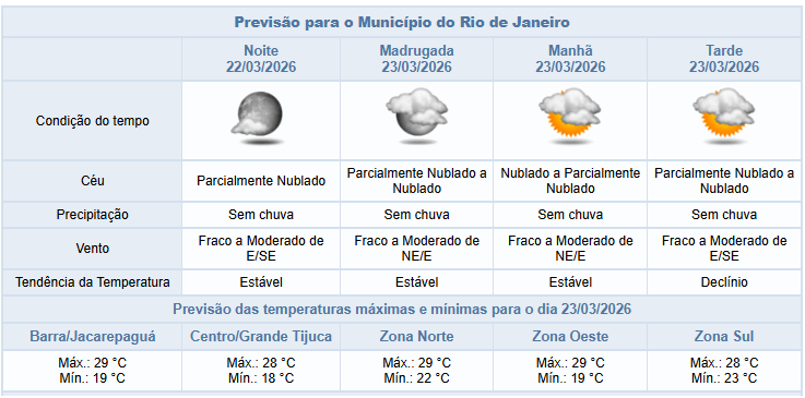 Neste fim de tarde e na noite deste domingo (22/03), o céu estará parcialmente nublado na cidade do Rio e não há previsão de chuva. Os ventos estarão fracos a moderados. Segundo o Alerta Rio, ao longo do dia as temperaturas permaneceram estáveis, com mínima registrada de 18,6°C e máxima de 32,1°C.