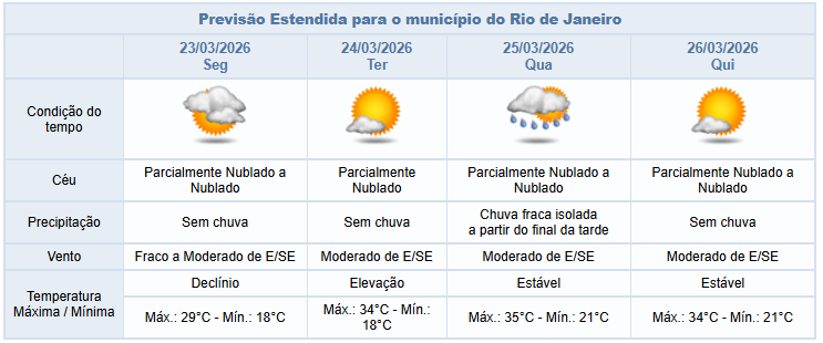 Na quarta-feira (25/03) áreas de instabilidade em diferentes níveis da atmosfera influenciarão o tempo no Rio, com aumento de nebulosidade e chuva fraca isolada a partir do final da tarde. Os ventos estarão predominantemente moderados.