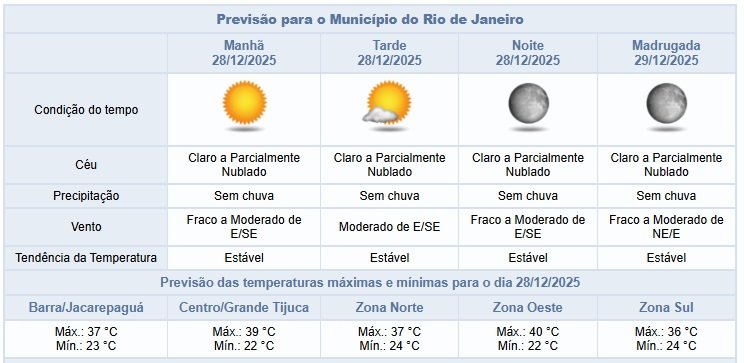 De acordo com o Alerta Rio, neste domingo (28/12) o tempo segue com temperaturas elevadas e sem chuva na cidade do Rio. A previsão é de pouca nebulosidade na maior parte do dia, ventos fracos a moderados, e as temperaturas estarão em elevação em relação ao dia anterior, com máxima prevista de 40°C.