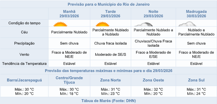 🌧️Na quarta e quinta-feira (01 e 02/04) a previsão para a cidade do Rio é de céu parcialmente nublado a nublado com chuva fraca a moderada isolada durante tarde e noite. Os ventos estarão moderados e as temperaturas em elevação.