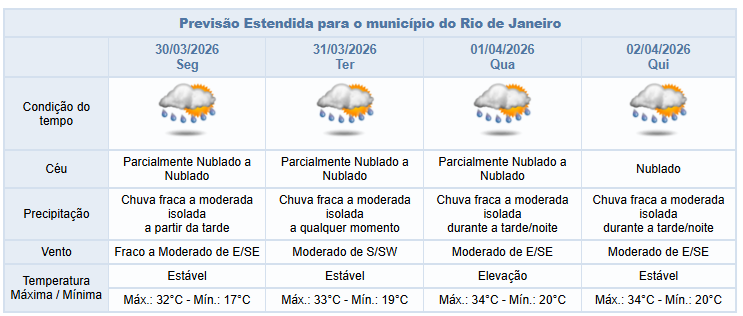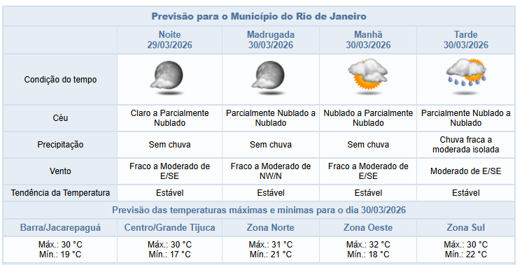 A segunda e a terça-feira (30/03 e 31/03) serão de tempo instável na cidade do Rio, ainda em função da entrada de ventos úmidos do oceano e da atuação de áreas de instabilidade. Haverá aumento de nebulosidade, com previsão de chuva fraca a moderada isolada a partir da tarde de segunda e a qualquer momento de terça. Os ventos irão variar entre fracos e moderados.