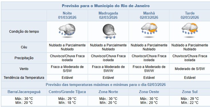 Nesta noite de domingo (01/03), haverá predomínio de céu nublado, os ventos estarão ocasionalmente moderados e há previsão de chuvisco/chuva fraca isolada. Ao longo do dia, a temperatura mínima registrada foi de 19,1°C e a máxima de 28,8°C.