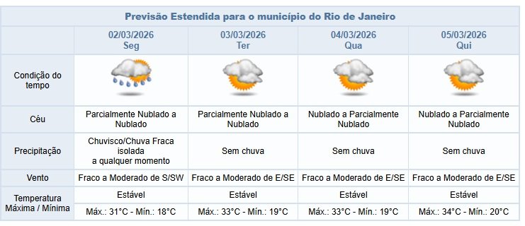 Entre a terça-feira e quinta-feira (03/03 e 05/03), a nebulosidade estará variada e não há previsão de chuva. Os ventos estarão fracos a moderados.