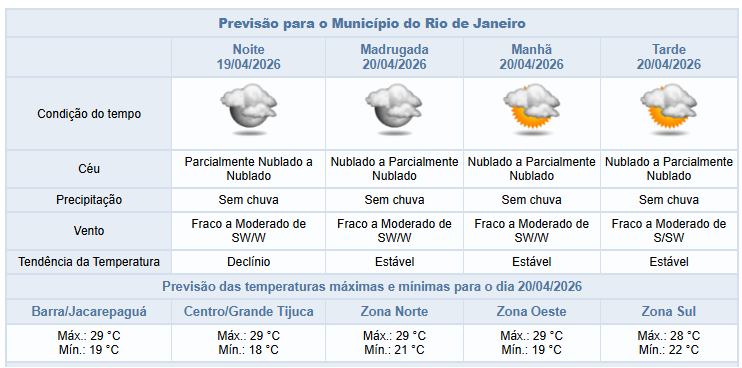 Segundo o Alerta Rio, neste fim de tarde e na noite deste domingo (19/04) a nebulosidade estará variada na cidade do Rio e não há previsão de chuva. Os ventos estarão fracos a moderados. Ao longo do dia, as temperaturas apresentaram declínio, com mínima registrada de 19,6°C e máxima registrada de 30,1°C.