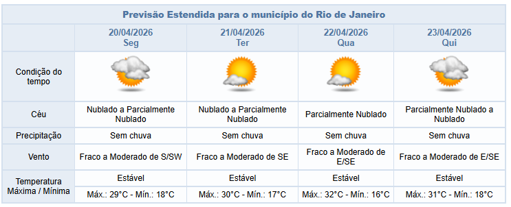 Entre a segunda e a quinta-feira (20/04 e 23/04), a nebulosidade estará variada, com predomínio de céu parcialmente nublado e sem previsão de chuva. Os ventos estarão fracos a moderados.