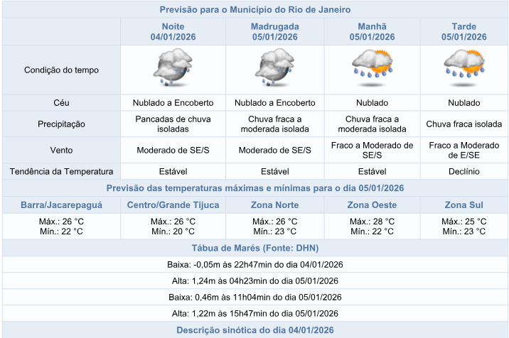 Neste final de tarde e na noite deste domingo (04/01), o céu estará nublado na cidade do Rio e ainda há condições para ocorrência de pancadas de chuva. Os ventos estarão moderados.