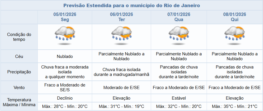 Na segunda-feira (05/01), por conta da atuação de um canal de umidade sobre a Região Sudeste, a nebulosidade estará variada com predomínio de céu nublado e a previsão é de chuva fraca a ocasionalmente moderada a qualquer momento. Os ventos estarão moderados.
