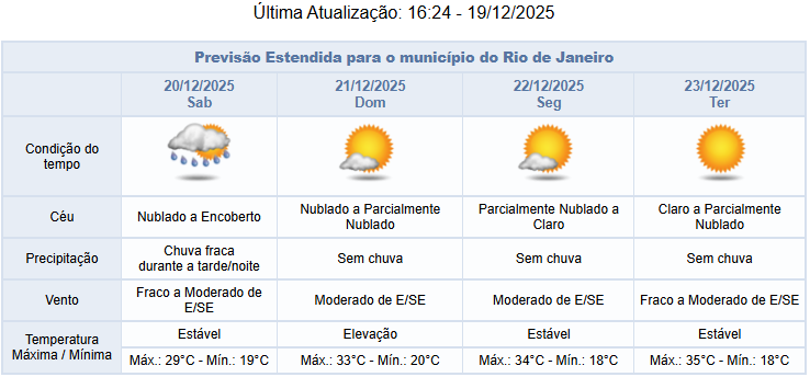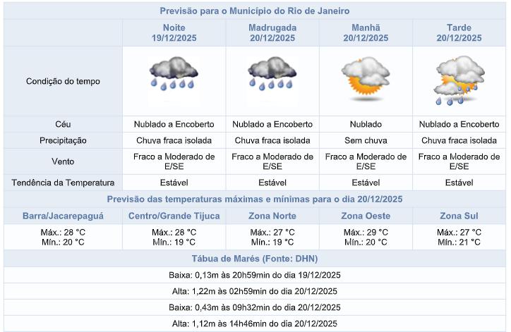 No sábado (20/12), o tempo seguirá instável na cidade do Rio, com nebulosidade variada e previsão de chuva fraca nos períodos da tarde e noite. Os ventos estarão fracos a moderados.