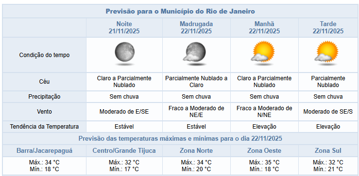 Neste final de tarde e na noite desta sexta-feira (21/11), haverá predomínio de céu claro na cidade do Rio de Janeiro e não há previsão de chuva. Os ventos estarão predominantemente moderados.