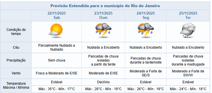 No sábado (22/11), o tempo estará estável, com predomínio de céu parcialmente nublado e sem chuva. Os ventos irão variar entre fracos a moderados, sendo mais intensos no período da tarde, e as temperaturas apresentarão elevação.
