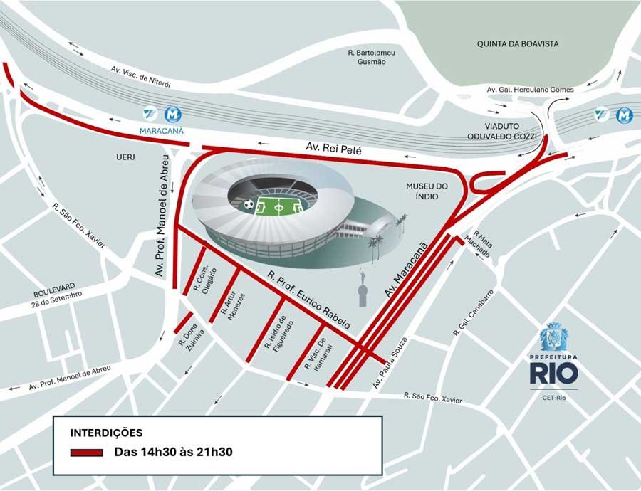 O Centro de Operações e Resiliência da Prefeitura do Rio (COR-Rio) informa que, a CET-Rio vai realizar, neste domingo (05/04), uma operação de trânsito para o jogo entre Flamengo e Santos pelo Campeonato Brasileiro, que acontecerá às 17h30, no estádio do Maracanã. As interdições ao trânsito de veículos na região começam a partir das 14h30 e vão até as 21h30.