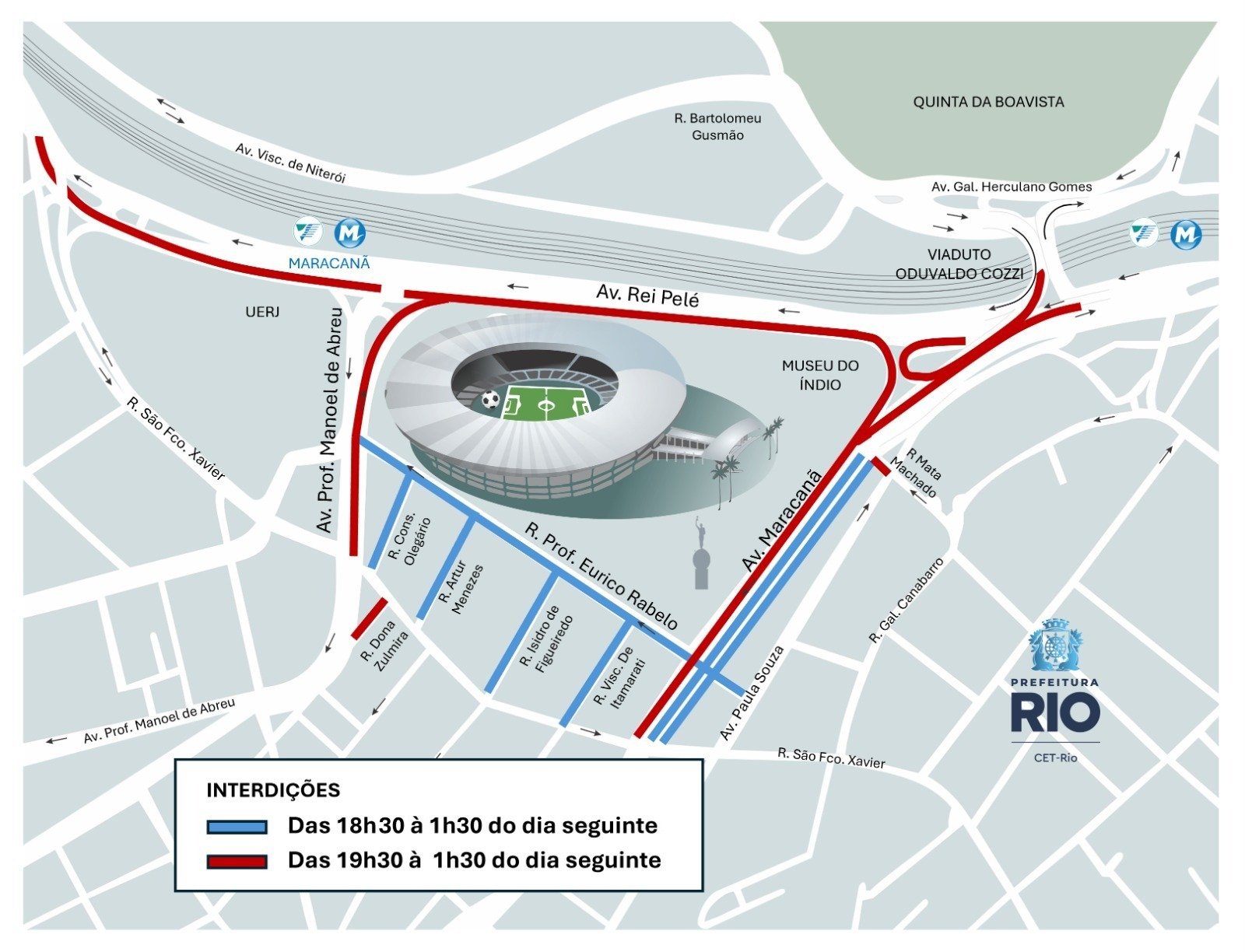 O Centro de Operações e Resiliência da Prefeitura do Rio (COR-Rio) informa que será implementada uma operação especial de trânsito das 18h30 desta quarta-feira (15/04) à 1h30 de quinta-feira (16/04), para o jogo entre Fluminense e Independiente Rivadavia (ARG), válido pela Conmebol Libertadores. A partida acontecerá às 21h30, no Estádio do Maracanã. De acordo com o esquema da CET-Rio, além das proibições já existentes, outras vias terão restrição de estacionamento a partir das 10h.