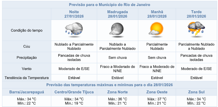 Segundo o Alerta Rio, neste final de tarde e na noite desta terça-feira (27/01), o céu estará nublado a parcialmente nublado na cidade do Rio de Janeiro e há previsão de pancadas de chuva isoladas, acompanhadas de raios. Os ventos estarão moderados (18,5 km/h até 51,9 km/h).
