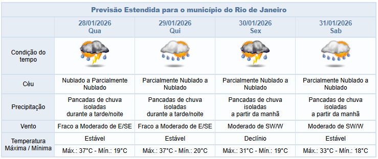 Na quarta (28/01) e na quinta-feira (29/01), em função de áreas de instabilidade, a nebulosidade estará variada, com céu nublado a parcialmente nublado e previsão de chuva isolada, fraca a moderada, a partir da tarde destes dias, podendo ocorrer pancadas. Os ventos estarão fracos a moderados e as temperaturas elevadas, com máxima prevista de 37°C .