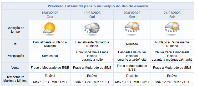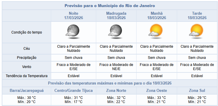 Segundo o Alerta Rio, a previsão do tempo para a noite desta terça-feira (17/03) é de céu claro a parcialmente nublado, sem chuva, e com ventos entre fracos a moderados. Durate o dia de hoje, o tempo esteve estável na cidade do Rio, com poucas nuvens no céu e sem registro de chuva. Os ventos estiveram fracos a moderados e as temperaturas registraram mínima de 17,4°C e máxima de 33,5°C.