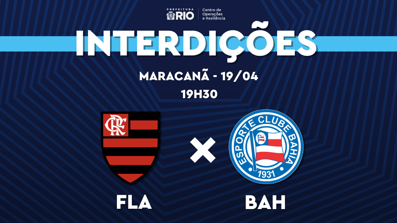O Centro de Operações e Resiliência da Prefeitura informa que a CET-Rio vai realizar uma operação especial de trânsito, neste domingo (19/04), para o jogo entre Flamengo e Bahia, pelo Campeonato Brasileiro, que acontece às 19h30, no estádio do Maracanã, na Zona Norte da cidade. As interdições ao trânsito de veículos terão início às 16h.
