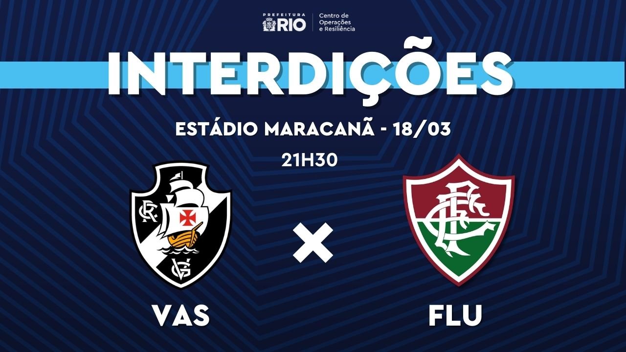 O Centro de Operações e Resiliência da Prefeitura do Rio (COR-Rio) informa que um esquema especial de trânsito foi elaborado pela CET-Rio para as vias no entorno do Maracanã, na Zona Norte da cidade, para a partida entre Vasco e Fluminense, pelo Campeonato Brasileiro, nesta quarta-feira (18/3). O jogo está marcado para às 21h30, mas as interdições começam às 18h30, com previsão de liberação à 0h30.
