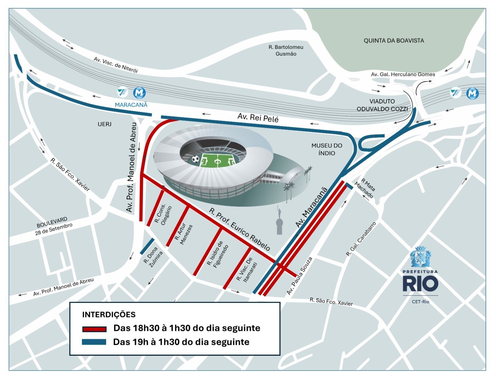 – Rua Professor Eurico Rabelo, entre a Avenida Professor Manoel de Abreu e o Portão 11B do Complexo Esportivo do Maracanã, no sentido da primeira para a segunda via, das 18h30 às 21h30.