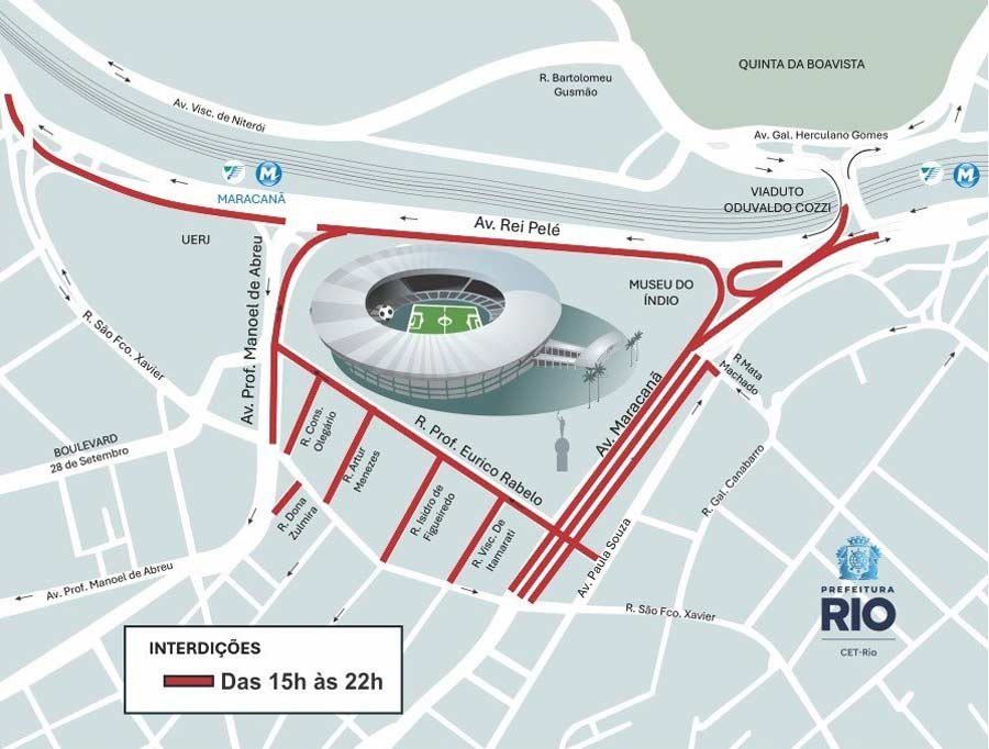 O Centro de Operações e Resiliência da Prefeitura do Rio (COR-Rio) informa que um esquema de trânsito foi elaborado pela CET-Rio para as vias no entorno do Maracanã, neste domingo (8/3), para a realização da partida Fluminense x Flamengo, às 18h, pelo Campeonato Carioca. As interdições começam às 15h, com previsão de liberação às 22h.