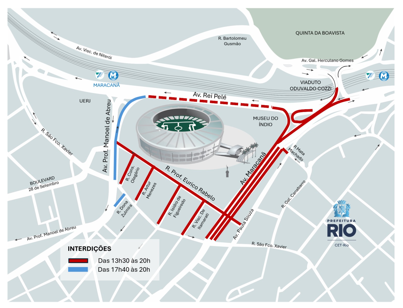 – Avenida Rei Pelé, sentido Centro, entre o Portão 2 do Complexo Esportivo do Maracanã e a Aldeia Maracanã/Museu do Índio;