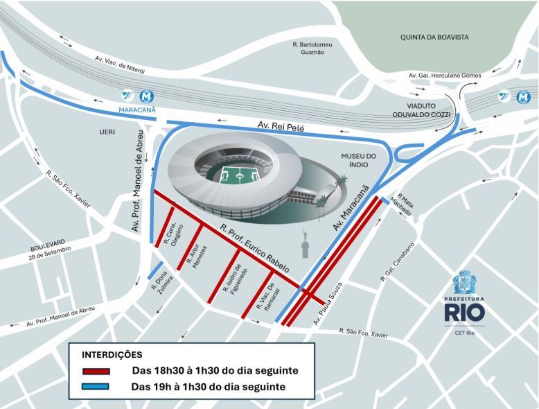 O Centro de Operações e Resiliência do Rio (COR-Rio) informa que o entorno do bairro do Maracanã, Zona Norte da cidade, vai passar por um esquema especial de trânsito para a realização do jogo entre Fluminense e Lanús, pela Copa Sul-Americana, nesta terça-feira (23/9). A partida está prevista para começar às 21h30, porém o estacionamento na região será proibido a partir das 10h e as interdições vão começar a partir de 18h30.