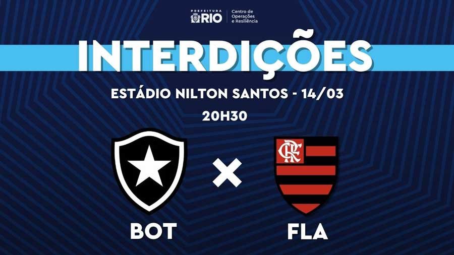 O Centro de Operações e Resiliência da Prefeitura do Rio (COR-Rio) informa que um esquema de trânsito foi elaborado pela CET-Rio para as vias no entorno do Estádio Nilton Santos, neste sábado (14/3), para a realização da partida Botafogo x Flamengo, às 20h30, pelo Campeonato Brasileiro. As interdições começam às 17h30, com previsão de liberação à 0h30.