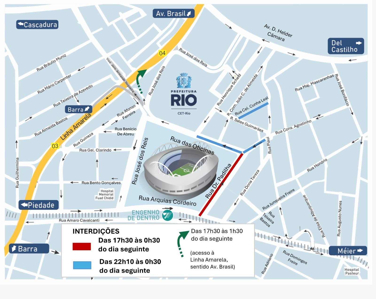 O acesso à Linha Amarela, sentido Avenida Brasil/Fundão, poderá ser realizado pela Rua das Oficinas Jornalista Luiz Mendes, a partir do cruzamento com a Rua José dos Reis, sob o Viaduto Jornalista Armando Nogueira.