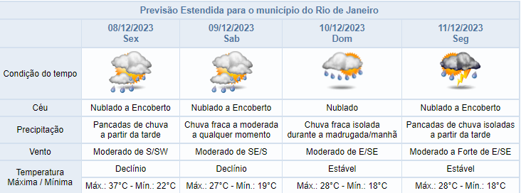 Na sexta-feira (08/12), a aproximação e o lento deslocamento de uma frente fria sobre o oceano manterão o tempo instável, com previsão de pancadas de chuva a partir da tarde. A chuva poderá passar de 25mm/h em pelo menos um ponto da cidade. As temperaturas estarão em declínio.